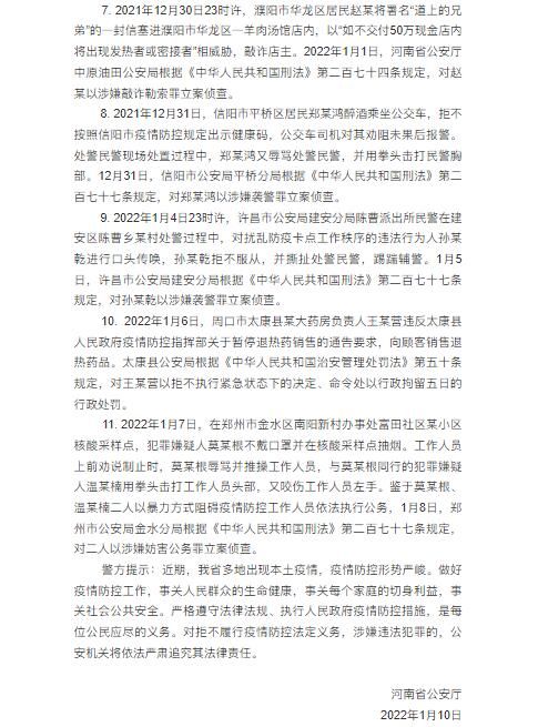 荔枝新闻讯 河南省公安厅官方微博1月11日凌晨发布一则警方通报,通报处理11起涉疫案件。全文如下: