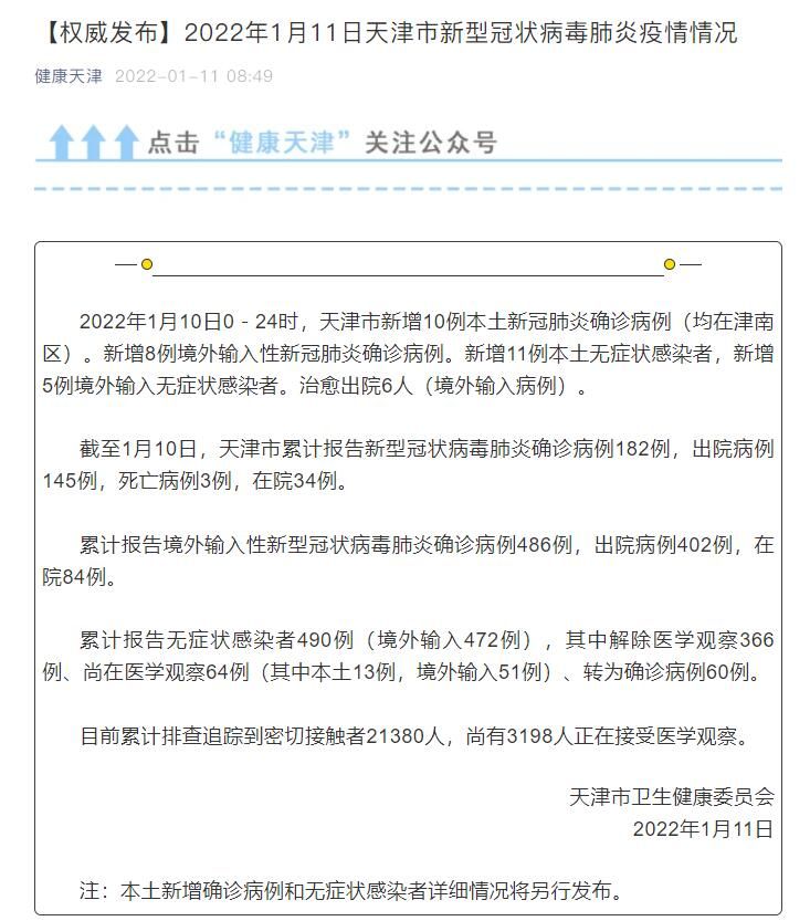 荔枝新闻讯 据“健康天津”微信公众号消息,2022年1月10日0-24时,天津市新增10例本土新冠肺炎确诊病例(均在津南区)。新增8例境外输入性新冠肺炎确诊病例。新增11例本土无症状感染者,新增5例境外输入无症状感染者。治愈出院6人(境外输入病例)。