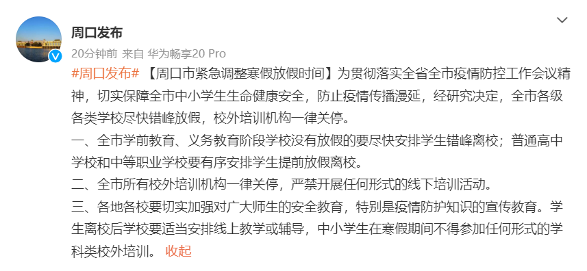 荔枝新闻讯 “周口发布”官方微博1月11日消息,为贯彻落实全省全市疫情防控工作会议精神,切实保障全市中小学生生命健康安全,防止疫情传播漫延,经研究决定,河南周口市各级各类学校尽快错峰放假,校外培训机构一律关停。
