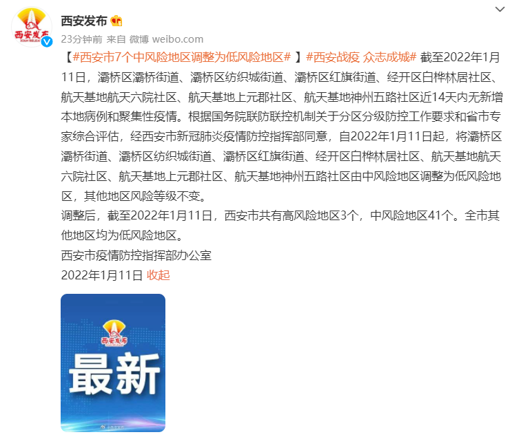 荔枝新闻讯 “西安发布”微博1月11日消息,截至2022年1月11日,西安市灞桥区灞桥街道、灞桥区纺织城街道、灞桥区红旗街道、经开区白桦林居社区、航天基地航天六院社区、航天基地上元郡社区、航天基地神州五路社区近14天内无新增本地病例和聚集性疫情。根据国务院联防联控机制关于分区分级防控工作要求和省市专家综合评估,经西安市新冠肺炎疫情防控指挥部同意,自2022年1月11日起,将灞桥区灞桥街道、灞桥区纺织城街道、灞桥区红旗街道、经开区白桦林居社区、航天基地航天六院社区、航天基地上元郡社区、航天基地神州五路社区由中风险地区调整为低风险地区,其他地区风险等级不变。