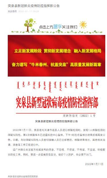 荔枝新闻讯 据“突泉微讯”微信公众号消息,2022年1月11日,内蒙古突泉县在对天津市返县人员进行核酸检测时,发现1人核酸检测初筛疑似阳性,第2次核酸样本已送盟疾控中心复核,下午1时左右复核出结果后将再发公告。目前,与初筛疑似阳性人员密切接触人员已全部管控,核酸结果待出,其他相关流调、排查等工作正在进行中。