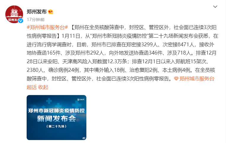 荔枝新闻讯 “郑州发布”微博11月11日消息,从“郑州市新冠肺炎疫情防控”第二十九场新闻发布会获悉,在进行流行病学调查时,目前,郑州市已排查在郑密接3299人、次密接8471人,接收外地协查函165件、涉及郑州市292人,向外地发送协查函346件、涉及718人。排查12月28日以来安阳、天津高风险入郑数据12.3万条;排查12月1日以来入郑航班15架次、2380人、确诊病例24例,其中境外输入18例、治愈复阳2例、本土病例4例。在全员核酸筛查中,封控区、管控区外,社会面已连续3次阳性病例零报告。