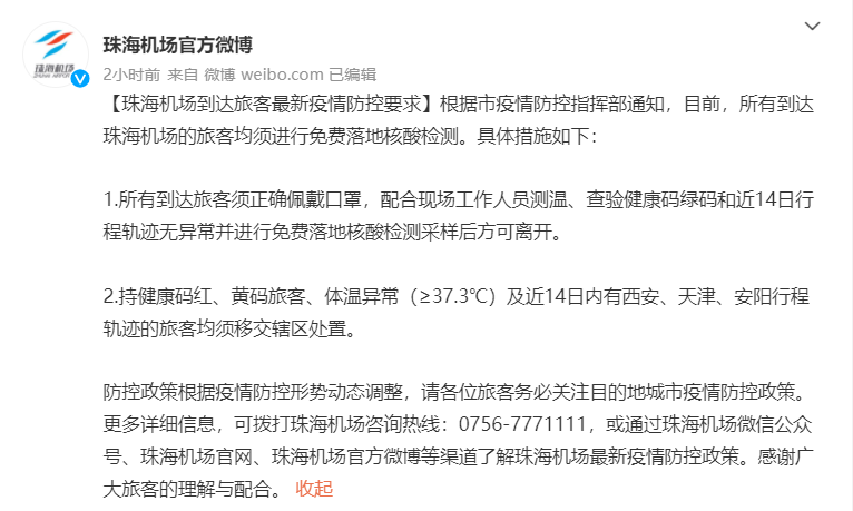 荔枝新闻讯 “珠海机场官方微博”1月11日消息,根据珠海市疫情防控指挥部通知,目前,所有到达珠海机场的旅客均须进行免费落地核酸检测。具体措施如下: