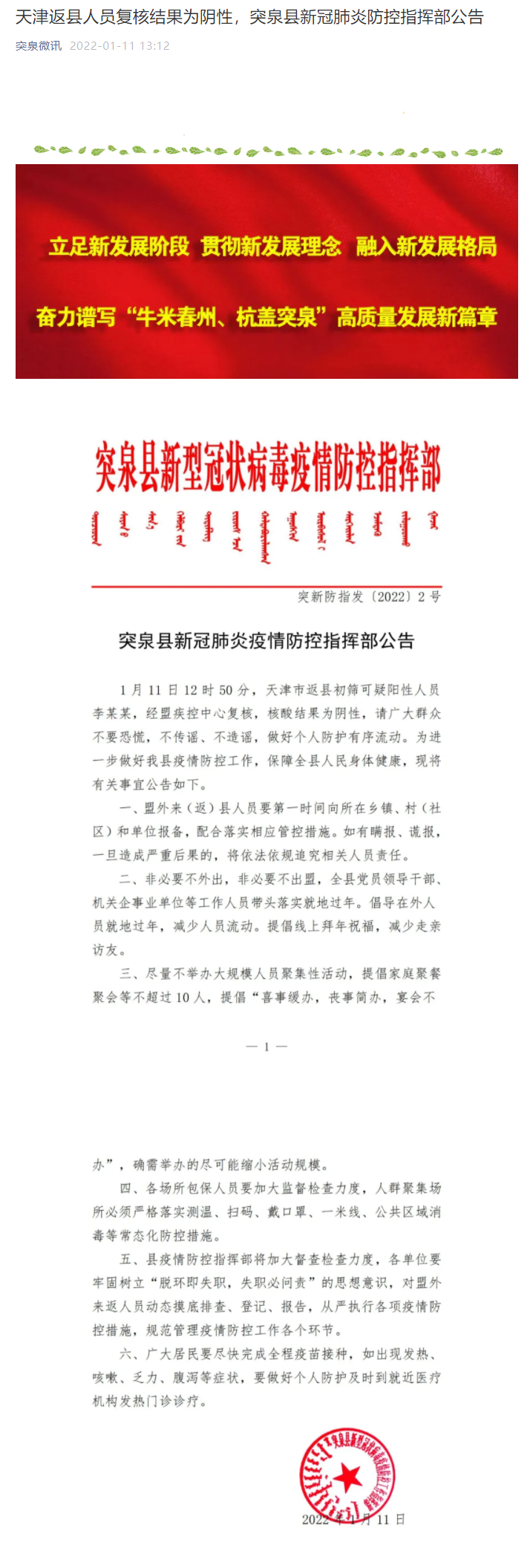 荔枝新闻讯 据“突泉微讯”消息,1月11日12时50分,天津市返县初筛可疑阳性人员李某某,经盟疾控中心复核,核酸结果为阴性。