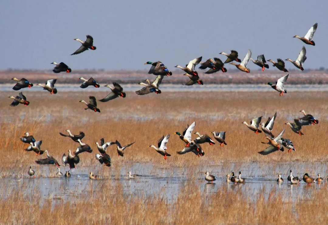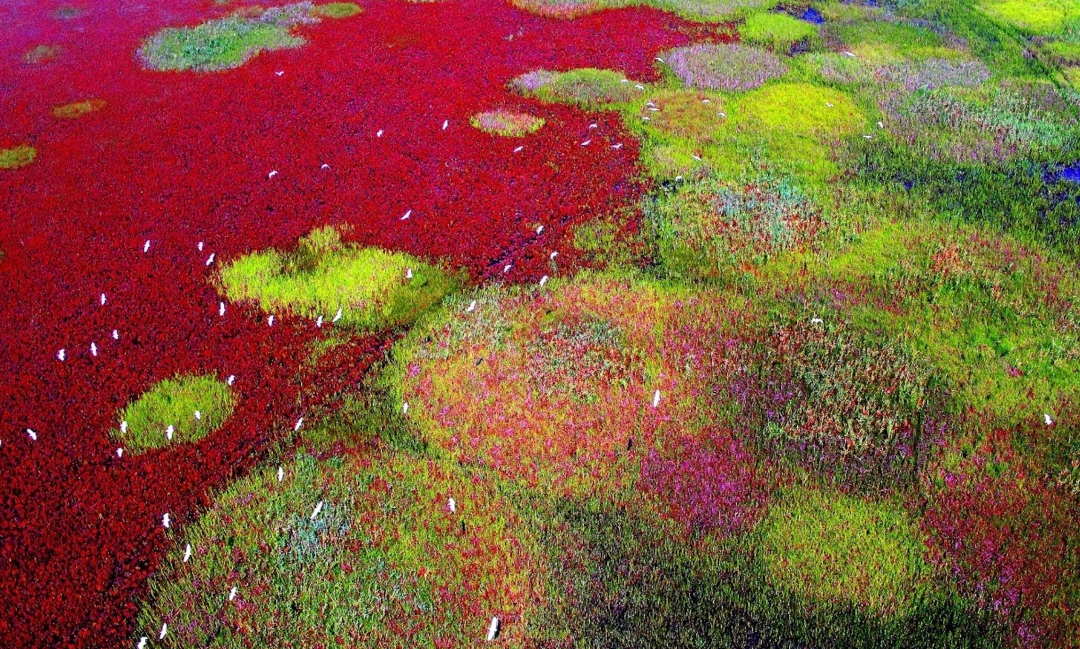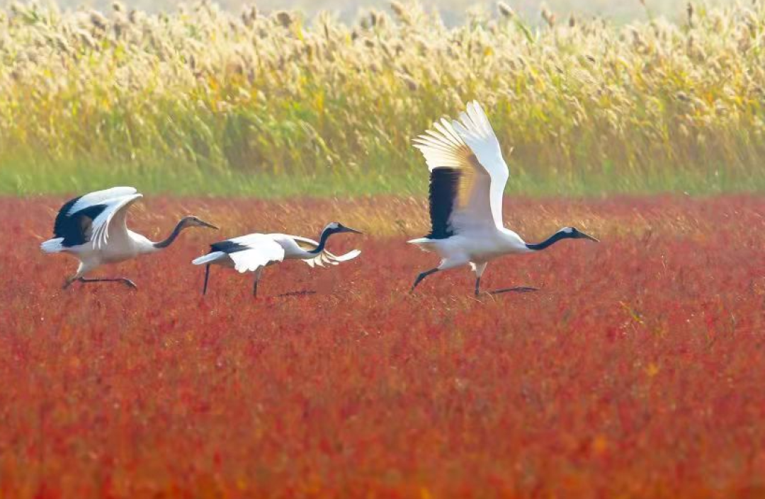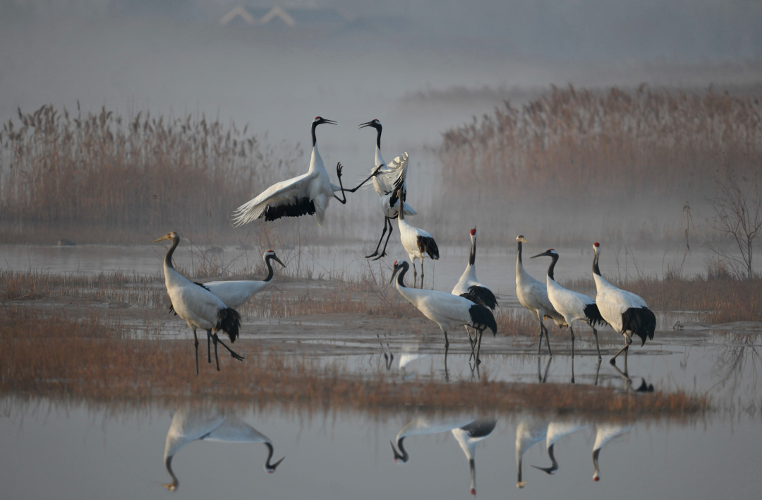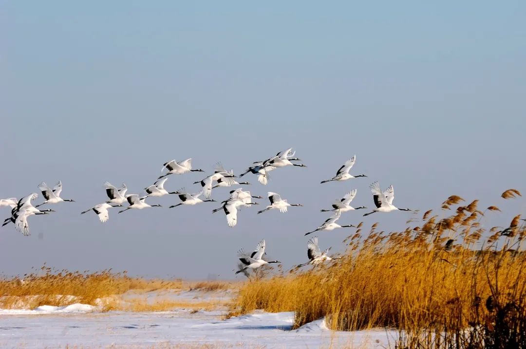 只听见扑棱一声,仙鹤振翅,灵动的姿态宛如仙子一般优雅。放眼望去,满目皆是丹顶鹤的身影,它们被誉为“湿地之神”。