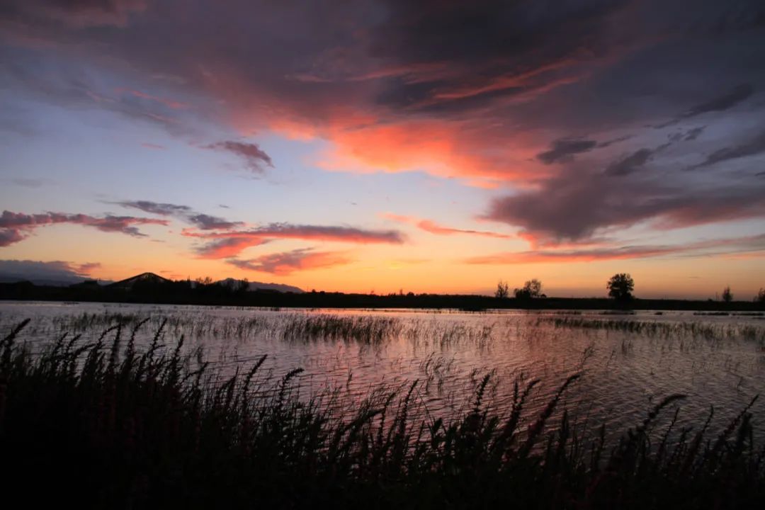 翻腾的晚霞,像烟花绚烂般绽放在天际。余晖落在村落的屋顶,落入波澜的湖面,也落进人的眼眸。湿地边的芦苇被漆上了一层淡淡的霞光。