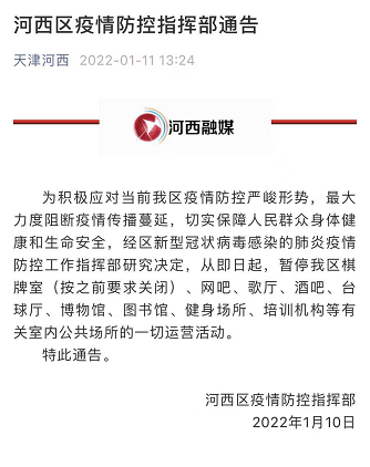 为积极应对当前我区疫情防控严峻形势,最大力度阻断疫情传播蔓延,切实保障人民群众身体健康和生命安全,经区新型冠状病毒感染的肺炎疫情防控工作指挥部研究决定,从即日起,暂停我区棋牌室(按之前要求关闭)、网吧、歌厅、酒吧、台球厅、博物馆、图书馆、健身场所、培训机构等有关室内公共场所的一切运营活动。