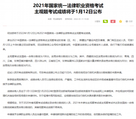 参加2021年国家统一法律职业资格考试主观题考试的各省(区、市)、新疆生产建设兵团及香港、澳门考区应试人员,可自1月12日上午8时通过司法部官网、司法部微信公众号和中国普法网、中国普法微信公众号查询本人成绩,自行下载打印成绩通知单。