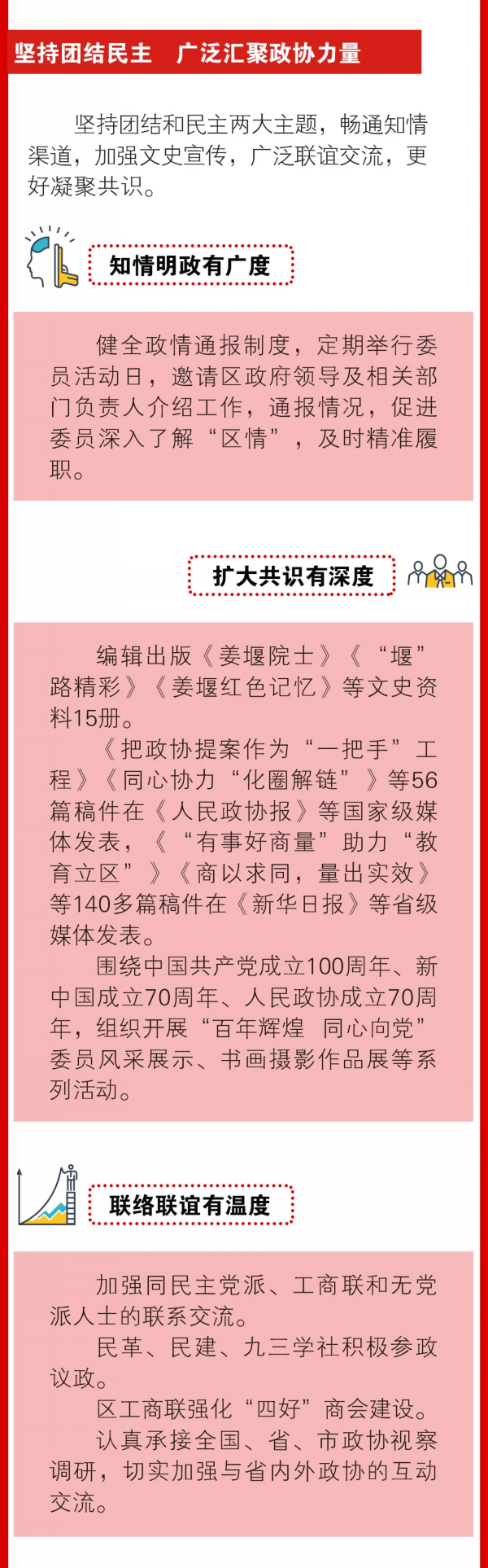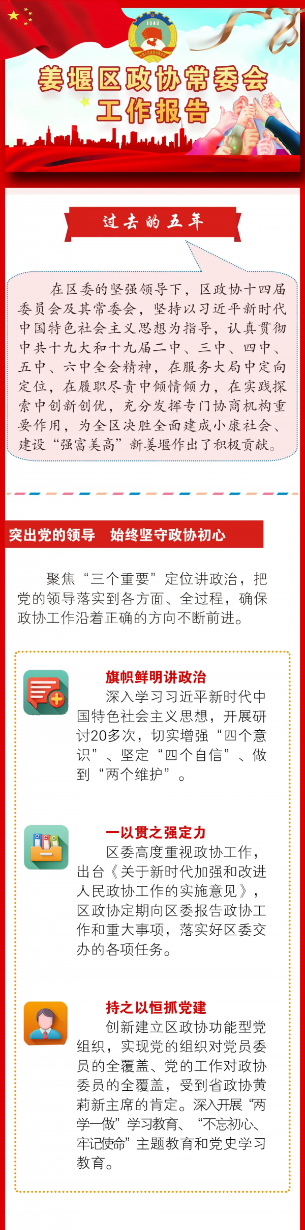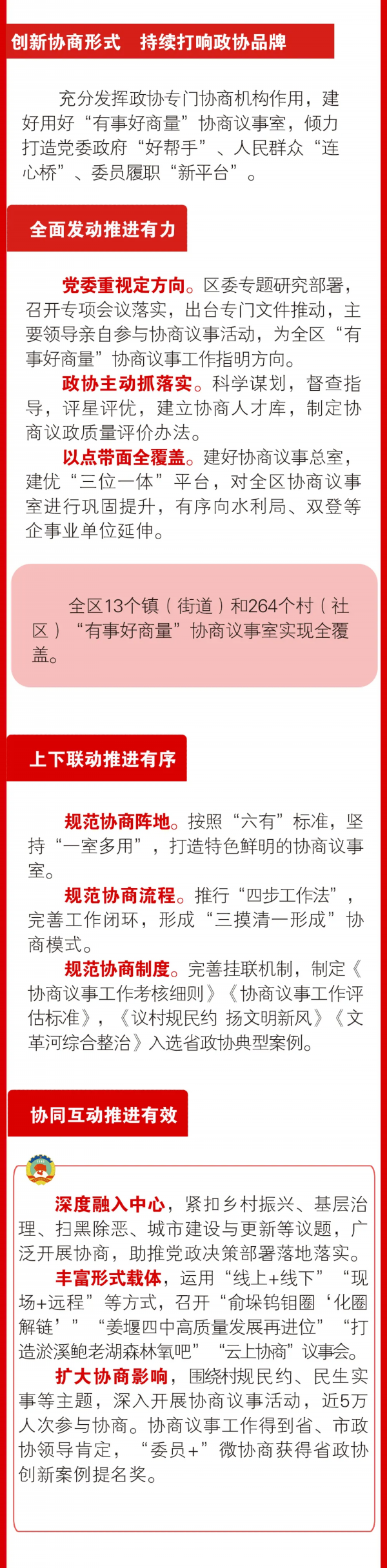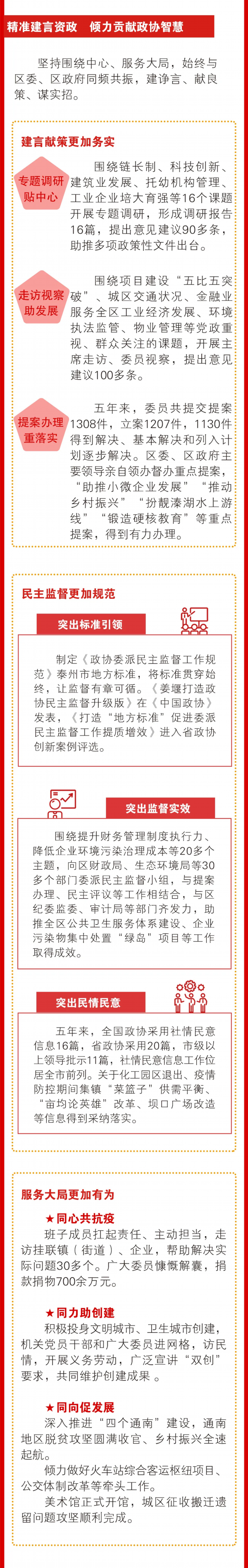 ——五年来,全区政协组织和广大政协委员大力改革创新,致力效能提升。“委员+”微协商、《政协委派民主监督工作规范》地方标准连续两年入围省政协创新案例复审,特别是《委派民主监督工作规范》系全省首创,获《中国政协》专题刊登、新华日报头版报道。创新建立区政协功能型党组织,推进政协系统党的建设“两个全覆盖”。不断扩大协商参与面,倾力打造“云上政协”,探索跨区域融合协商,推进姜堰海安两地交通路网的互联互通,推动政协制度优势转化为基层治理效能。
