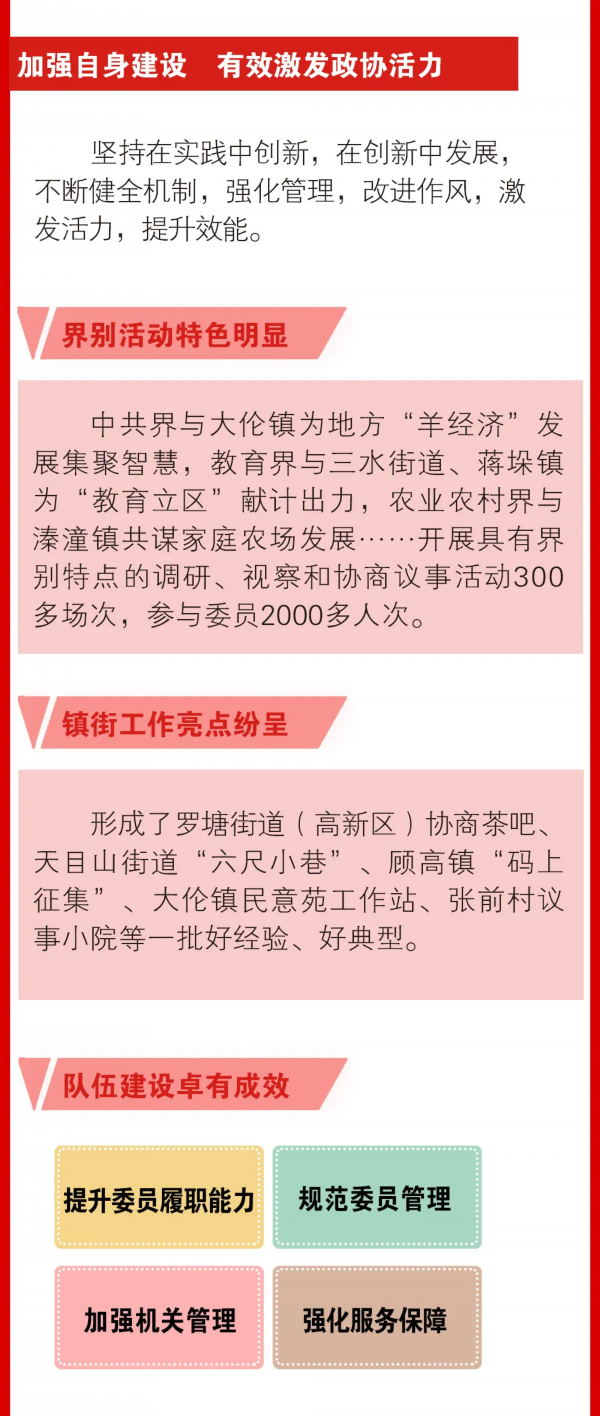 ——五年来,全区政协组织和广大政协委员聚焦发展大局,致力担当有为。紧扣“一主两副三片区”功能优化、“四新产业”发展、教育品质提升、全域旅游、乡村振兴等重点工作,主动担当履职、积极建言献策,“亩均论英雄”改革等一批意见和建议转化为区委、区政府决策部署。特别是新冠肺炎疫情发生之后,广大政协委员和政协工作者主动参与防控工作,有的白衣为袍、逆行出征;有的捐款捐物、组织生产;有的下沉社区、志愿服务,为夺取疫情防控和经济社会发展“双胜利”作出了积极贡献。