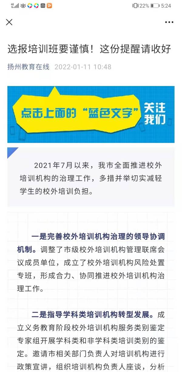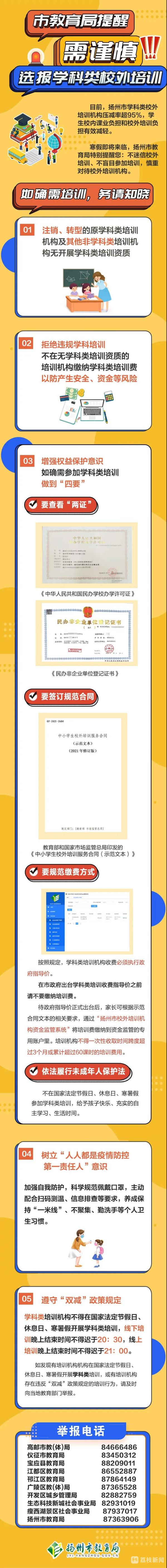 2021年7月以来,扬州市全面推进校外培训机构的治理工作,多措并举切实减轻学生的校外培训负担。今天(1月11日),扬州教育局提醒,选报培训班要谨慎!
