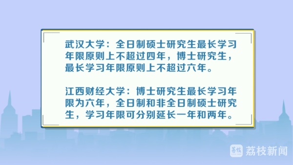 武汉大学、北京航空航天大学等知名高校,也在近期发布清退研究生的公告。上述学校给出的清退理由均为"在规定的学习年限内未完成学业"。武汉大学明确,全日制硕士研究生最长学习年限原则上不超过四年,博士研究生,最长学习年限原则上不超过六年。江西财经大学博士研究生最长学习年限为六年,全日制和非全日制硕士研究生,学习年限可分别延长一年和两年。记者从江苏省教育厅获悉,江苏没有制定过研究生最长学习年限的相关标准,最长学习年限由各校制定。