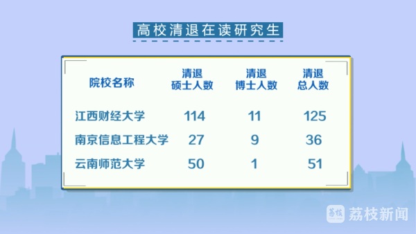 日前,江西财经大学研究生院发布公告,对包括11名博士在内的125名研究生作自动退学处理。其中1人为2004年入学,距今已有18年时间。南京信息工程大学、云南师范大学也相继发布公告,两校分别拟清退36名和51名在读研究生。