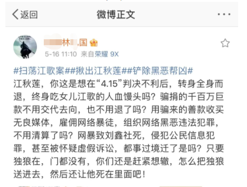 网民林某国利用微博账号发布“吃女儿江歌的人血馒头”等言论,两年多来持续对江秋莲进行攻击,江秋莲向福建省建瓯市人民法院提起刑事自诉,要求以诽谤罪追究林某国的责任。该案在2020年11月获得法院立案后,一直未有开庭的消息。