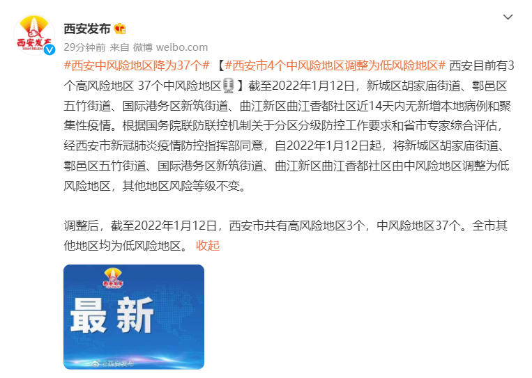 荔枝新闻讯 “西安发布”微博1月12日消息,截至2022年1月12日,西安市新城区胡家庙街道、鄠邑区五竹街道、国际港务区新筑街道、曲江新区曲江香都社区近14天内无新增本地病例和聚集性疫情。根据国务院联防联控机制关于分区分级防控工作要求和省市专家综合评估,经西安市新冠肺炎疫情防控指挥部同意,自2022年1月12日起,将新城区胡家庙街道、鄠邑区五竹街道、国际港务区新筑街道、曲江新区曲江香都社区由中风险地区调整为低风险地区,其他地区风险等级不变。
