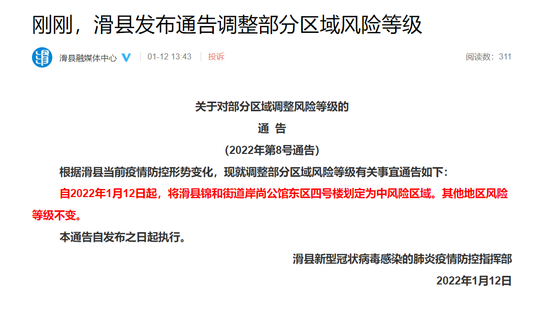自2022年1月12日起,将滑县锦和街道岸尚公馆东区四号楼划定为中风险区域。其他地区风险等级不变。