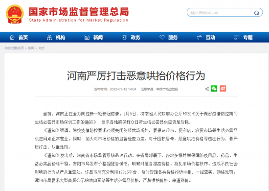 《通知》发出后,河南省市场监管系统迅速行动。在省局部署下,各地多措并举保障防疫用品、药品、生活必需品价格平稳。安阳市局发布价格提醒告诫书,明确对擅自提高价格、扰乱市场价格秩序、造成不良社会影响的行为从严从重查处。许昌市局充分利用12315平台,及时受理各类价格投诉举报,一经查实,顶格处罚。漯河市局要求大型商超公示粮油肉蛋菜等生活必需品价格,严禁哄抬价格、串通涨价。
