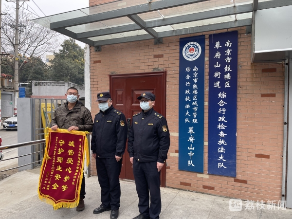 寒假即将来临,为了表达对校园门口值勤城管队员的感谢。10日上午,南京第二十九中学幕府山初级中学一位学生家长代表来到鼓楼区幕府山街道城管中队,将全班50位家长共同商议制作的锦旗,送给每天在学校门口值勤的张克松手里。
