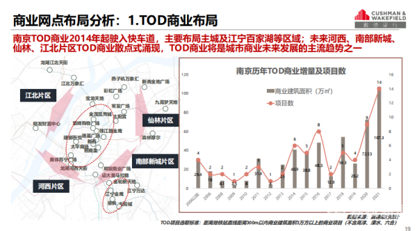 按南京商业网点布局分析,戴德梁行策略发展顾问部高级经理吴凡表示,TOD商业将是城市商业未来布局的主导方向。南京TOD商业数量从2014年开始快速增长,主要布局在主城及江宁百家湖区域,未来继续在河西、南部新城、仙林、江北板块散点式涌现。另外,2021年大批运营能力强劲的龙头房企抢占核心板块,布局高端商业产品线,未来将改变南京老牌百货主导的商业格局。