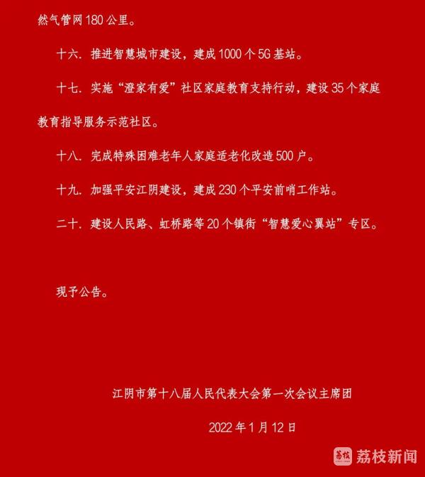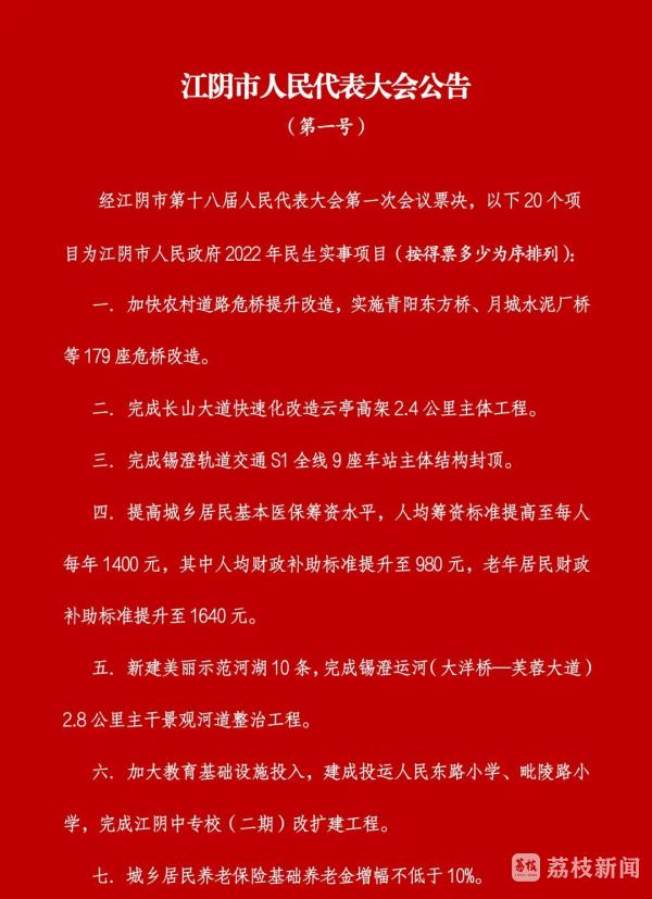 江阴市2022年度政府民生实事候选项目为25项,计划实施项目为20项。根据代表团的审议意见,主席团决定将这25个项目提请江阴市十八届人大一次会议第二次全体会议票决。