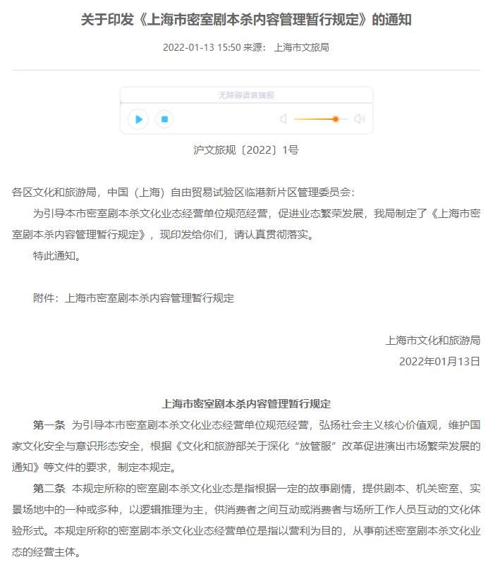 荔枝新闻讯 据上海市文旅局官网消息,为引导本市密室剧本杀文化业态经营单位规范经营,促进业态繁荣发展,上海市文旅局今日向社会公布了《上海市密室剧本杀内容备案管理规定》(征求意见稿),上海成为全国首个将剧本杀纳入备案管理的城市。具体规定内容如下: