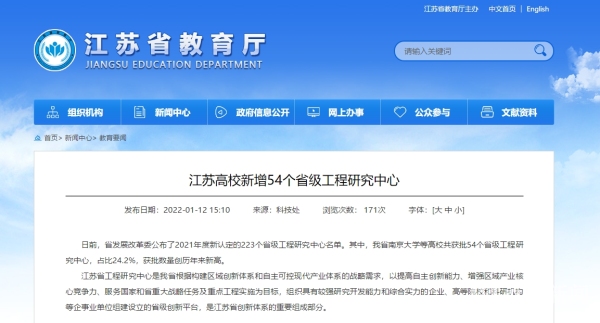 记者今天(1月13日)从江苏省教育厅获悉,日前,省发展改革委公布了2021年度新认定的223个省级工程研究中心名单。其中,江苏省南京大学等高校共获批54个省级工程研究中心,占比24.2%,获批数量创历年来新高。