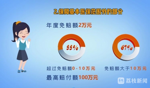 二是保障基本医保保障范围以外的部分。重点保障住院和门特治疗发生的合理且必须的医保目录外个人自费费用,包括医保目录外自费的药品和高值医用耗材,切实减轻患者医保目录外费用负担。该项责任年度免赔额2万元。“超过免赔额0至10万元”赔付55%,“超过免赔额10万元以上”赔付67%,最高赔付额100万元。
