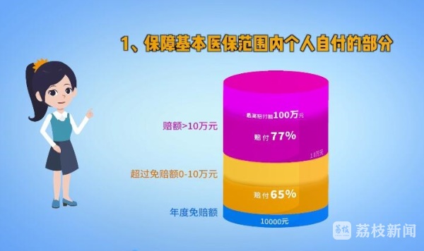 答:一是保障基本医保范围内个人自付的部分。重点保障住院、门特治疗以及使用国家谈判“双通道”药品发生的医保目录内费用,经基本医保保障后个人自付费用较高部分。该项责任年度免赔额1万元,“超过免赔额0至10万元”赔付65%,“超过免赔额10万元以上”赔付77%,最高赔付额100万元。
