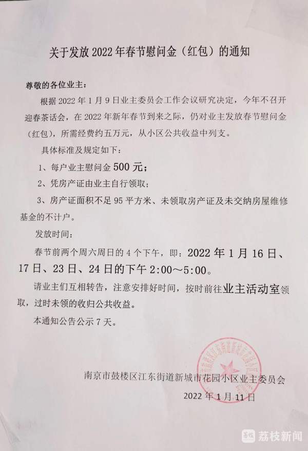 距离春节的脚步越来越近了,没想到,第一个拜年红包竟然是业委会给的,这就是传说中的“别人家”的小区。1月11日,网上流传着一张南京某小区业委会给业主发放慰问金(红包)的通知,让不少网友羡慕极了。