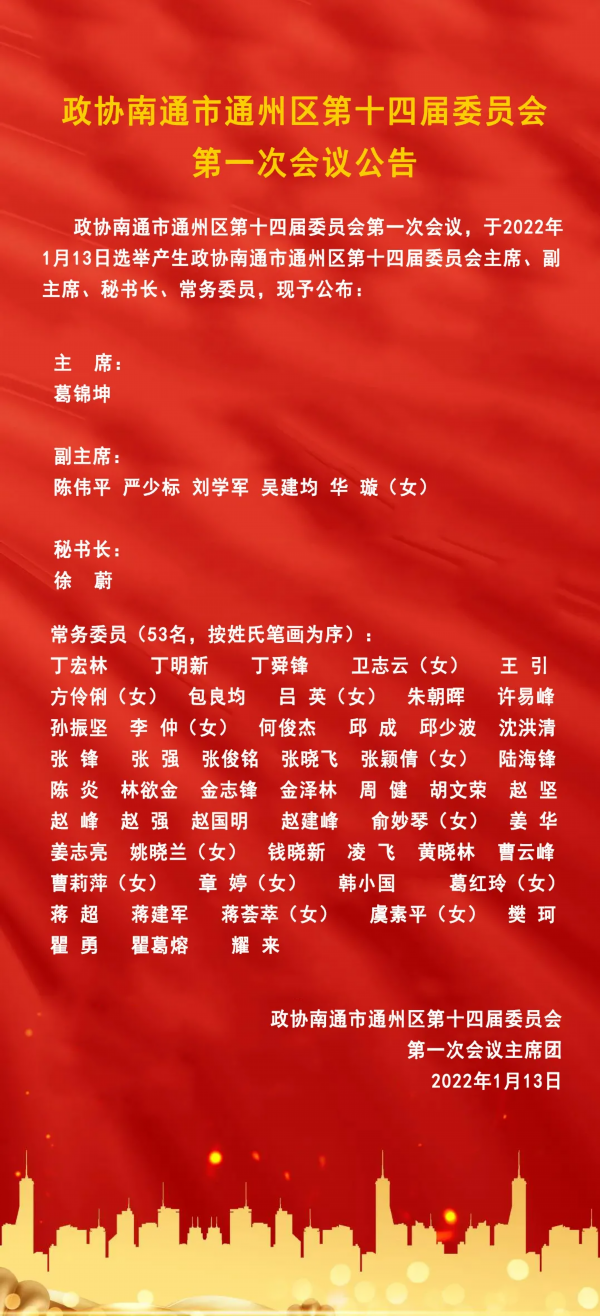 1月13日上午,政协南通市通州区第十四届委员会第一次会议举行选举大会。