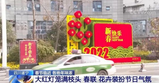 这几天,四川遂宁大街小巷大红灯笼挂满枝头,处处洋溢着喜庆热闹的氛围。一些路口以红、黄、绿为主色调的城市景观也一一亮相。