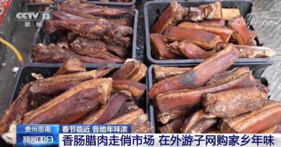 由于受疫情影响,很多在外的思南人选择就地过年,通过网络购买本地年货成为他们感受家乡年味的首选。思南土家腊味制作历史悠久,每年进入农历腊月,思南城乡到处腊味飘香。人们在制作腊味时将猪肉切成条、块状,用花椒、胡椒粉、八角等10余味佐料腌制5—7天后用烟熏、炭火烤制而成。
