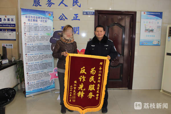 1月14日上午,镇江市民周女士特地来到镇江市公安局润州分局金山派出所,将一面写有“为民服务 反诈先锋”的锦旗送给了民警高学芝,感谢他及时打来电话劝阻,避免了受骗和财产损失。