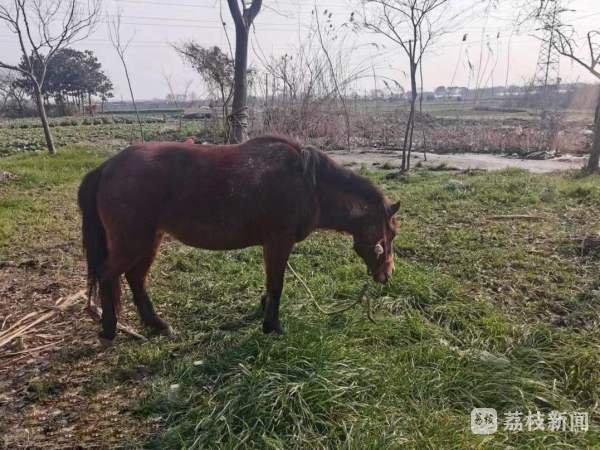 1月13日上午10时许,记者在导墅镇大南山墩村葛大爷家不远处的草地上看到,葛大爷捡到的确实是一匹马。这匹马除了马鬃是黑色,其他部位都是棕色中带着微红,冬日下远远望去,好像是一匹“赤兔马”。