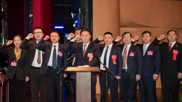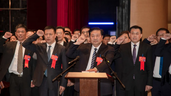 新当选人员在宣誓台前进行了宪法宣誓。