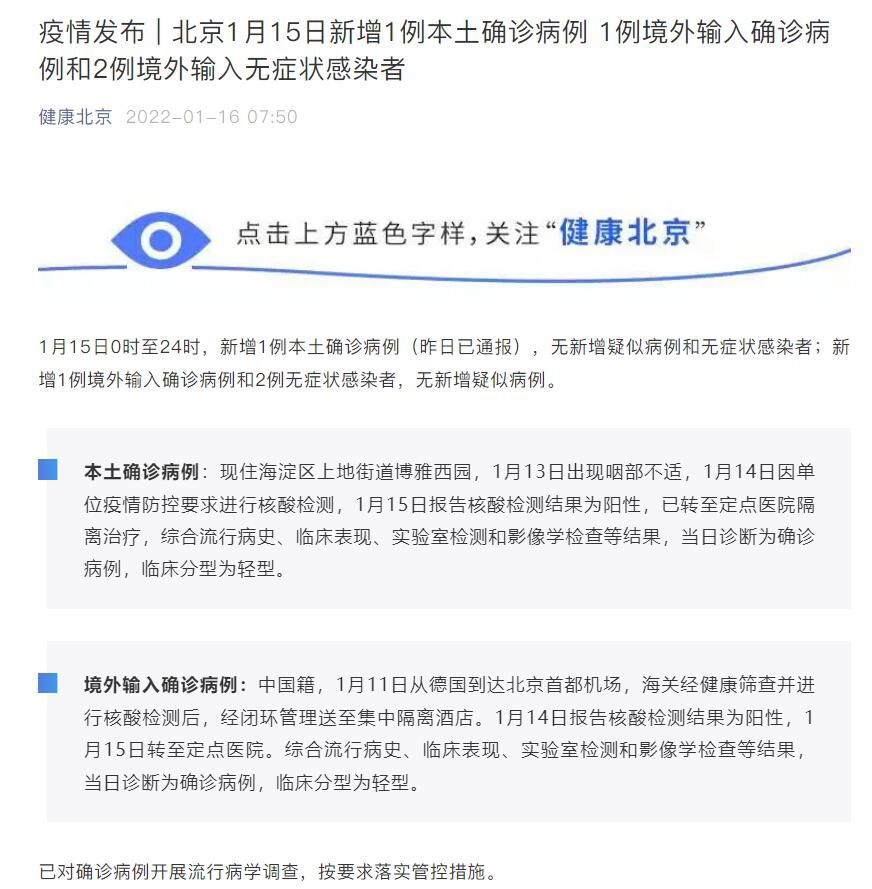 荔枝新闻讯 据“健康北京”微信公众号消息,1月15日0时至24时,北京新增1例本土确诊病例(昨日已通报),无新增疑似病例和无症状感染者;新增1例境外输入确诊病例和2例无症状感染者,无新增疑似病例。