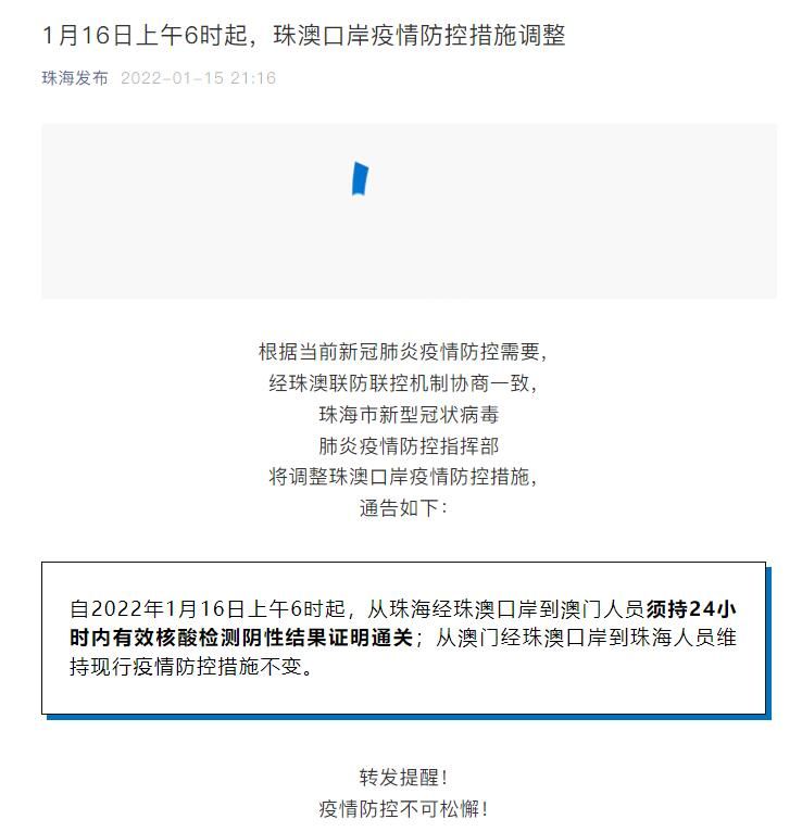 荔枝新闻讯 据“珠海发布”微信公众号1月15日晚消息,根据当前新冠肺炎疫情防控需要,经珠澳联防联控机制协商一致,珠海市新型冠状病毒肺炎疫情防控指挥部将调整珠澳口岸疫情防控措施,通告如下: