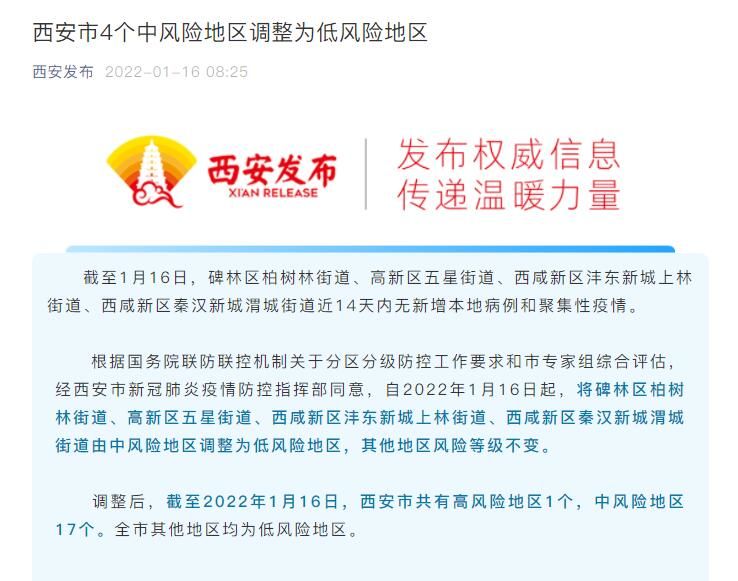 根据国务院联防联控机制关于分区分级防控工作要求和市专家组综合评估,经西安市新冠肺炎疫情防控指挥部同意,自2022年1月16日起,将碑林区柏树林街道、高新区五星街道、西咸新区沣东新城上林街道、西咸新区秦汉新城渭城街道由中风险地区调整为低风险地区,其他地区风险等级不变。