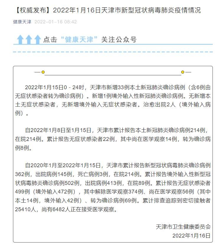 荔枝新闻讯 据“健康天津”微信公众号消息,2022年1月15日0-24时,天津市新增33例本土新冠肺炎确诊病例(含6例由无症状感染者转为确诊病例)。新增1例境外输入性新冠肺炎确诊病例。无新增本土无症状感染者,无新增境外输入无症状感染者。治愈出院2人(境外输入病例)。
