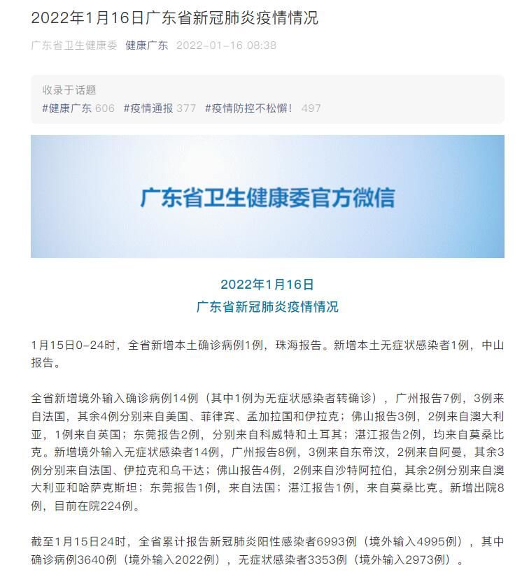 荔枝新闻讯 据“健康广东”微信公众号消息,1月15日0—24时,广东省新增本土确诊病例1例,珠海报告。新增本土无症状感染者1例,中山报告。