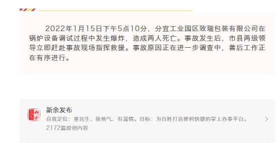 荔枝新闻讯 据新余发布微信公众号消息,2022年1月15日下午5点10分,分宜工业园区致瑞包装有限公司在锅炉设备调试过程中发生爆炸,造成两人死亡。事故原因正在进一步调查中,善后工作正在有序进行。