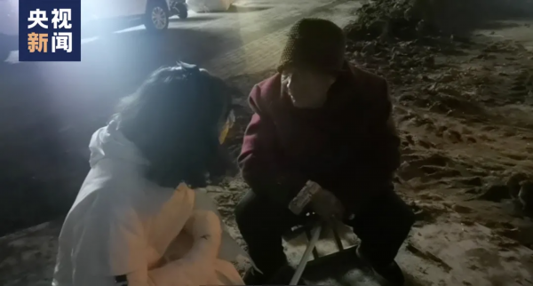 一对95后小情侣寒风中“哄孩子”式陪伴一位老奶奶