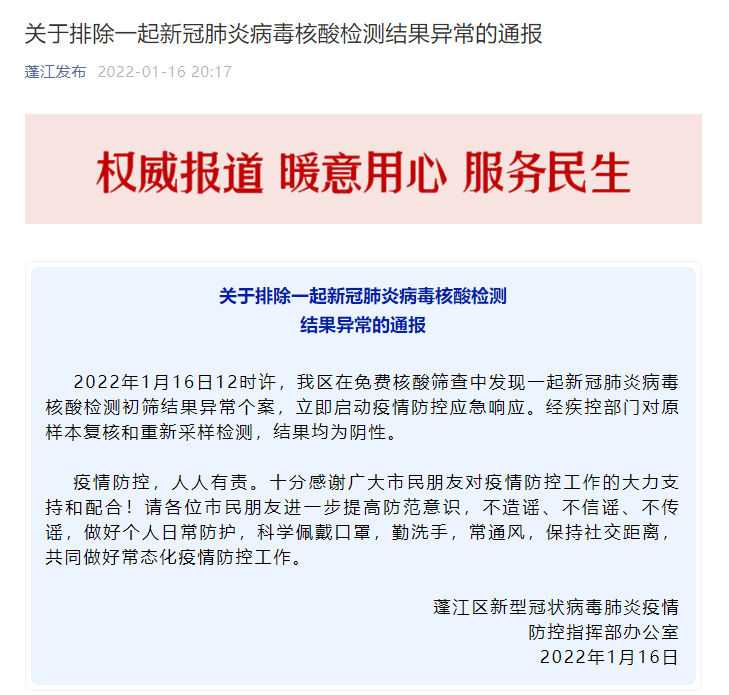 荔枝新闻讯 1月16日晚,“蓬江发布”微信公众号发布《关于排除一起新冠肺炎病毒核酸检测结果异常的通报》。