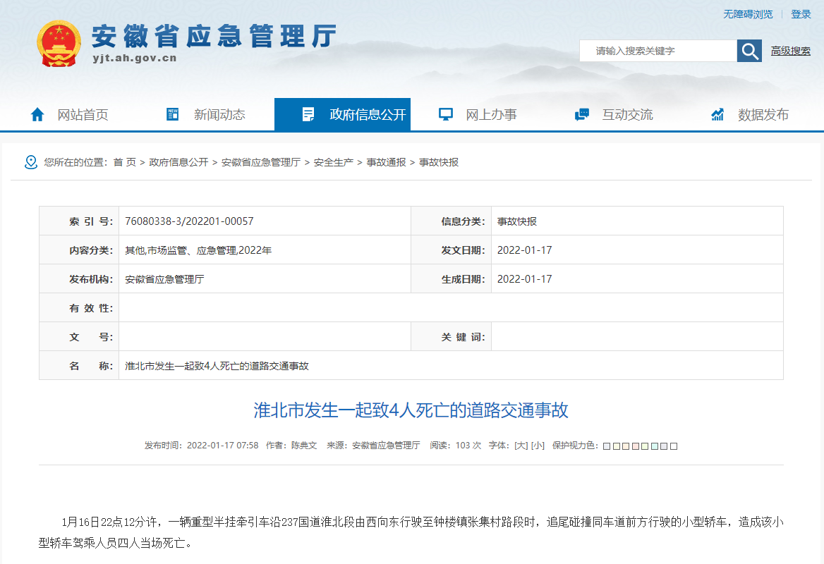 荔枝新闻讯 安徽省应急管理厅网站1月17日消息,1月16日22点12分许,一辆重型半挂牵引车沿237国道淮北段由西向东行驶至钟楼镇张集村路段时,追尾碰撞同车道前方行驶的小型轿车,造成该小型轿车驾乘人员四人当场死亡。