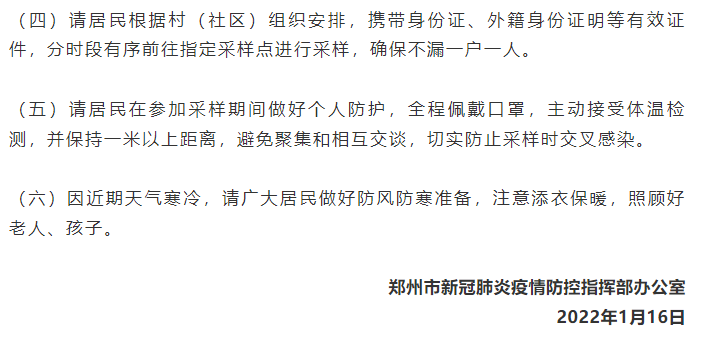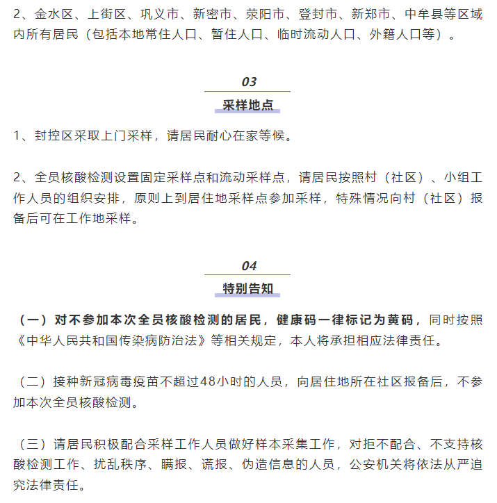 为彻底排查潜在人群感染者,经郑州市新冠肺炎疫情防控指挥部研究,决定开展金水区等8个区县(市)全员核酸检测,现将有关事宜通告如下: