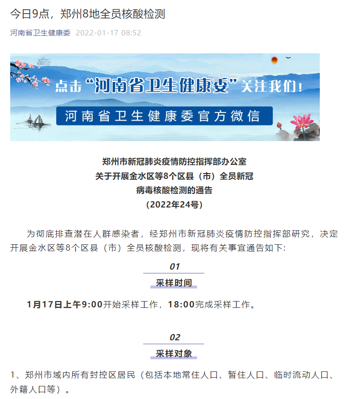 荔枝新闻讯 “河南省卫生健康委”微信公众号1月17日消息,郑州市新冠肺炎疫情防控指挥部办公室发布“关于开展金水区等8个区县(市)全员新冠病毒核酸检测的通告(2022年24号)。通告全文如下: