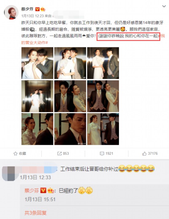 1月13日是蔡少芬和张晋结婚14周年纪念日,二人因工作太忙无法相聚,但蔡少芬透露称已经约好时间补过纪念日。