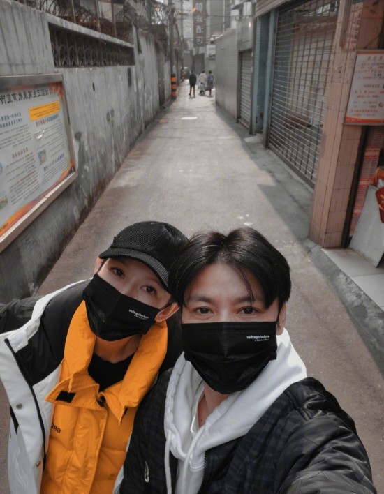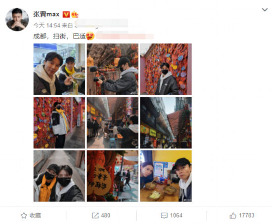1月17日,张晋在社交媒体分享一组和妻子蔡少芬同游成都的游客照。