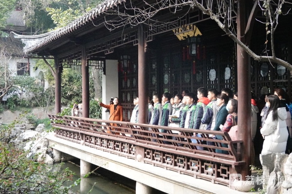 “‘环植寒梅处,横斜画阁东。’同学们方才路过的亭子叫岁寒亭,位于瞻园西假山,亭前有梅花景致,清代诗人袁枚看到后便赋诗一首,以咏梅花坞。”语文教师陈元芝带领学生在瞻园里实地赏景,感受文人笔下的园林美景。南京市第九初级中学学生杨煜梵说,从前自己只是走马观花似的浏览古典园林,今天在老师的带领下重走瞻园,逐渐体悟到园中一草一木一花一石皆为精心安排,“透过《江南·园林》一课,我对中国传统文化尤其是江南园林景致背后的美学内涵有了新的体会。”