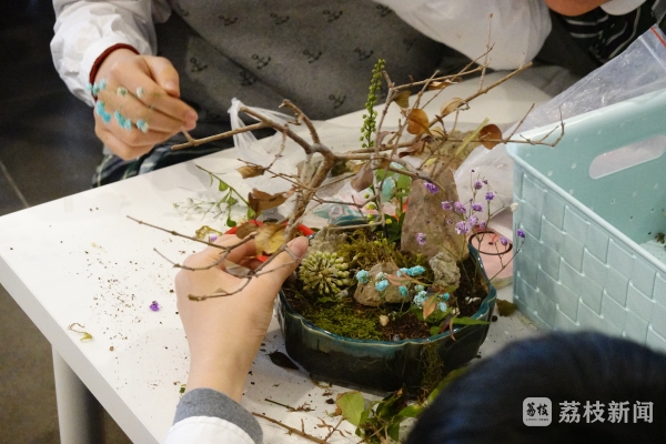 这一课,有诗情,亦有画意音境。美术教师朱晔从古人造园思想出发,深挖江南园林造园内涵,讲述中国园林美学特征,最后以树枝、石头为素材带领学生们一起制作园林微缩景观;音乐教师张仪带来九初特色艺术课程昆曲,在瞻园船舫上演实景版《牡丹亭·游园》昆曲演唱。
